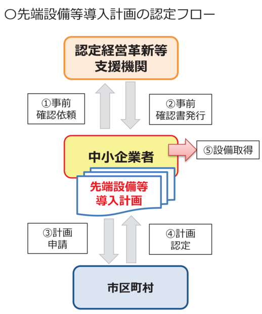 まず、先端設備等導入計画を作成のうえ、認定支援機関に認定支援機関確認書の発行を依頼してください。発行に時間を要する場合がありますので、余裕をもって依頼してください。