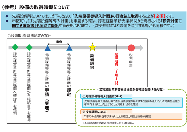 なお、設備取得は先端設備等導入計画の認定後となり、設備を既に取得している場合には先端設備等導入計画の認定を受けることはできません。