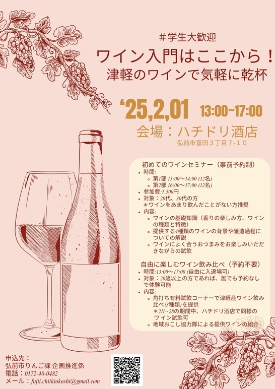 本イベントでは、ワインをあまり飲んだことがない初心者の方でも安心して楽しめるように、ワインの基本的な知識から、おすすめの種類まで、ワイン産地化に取り組む弘前市の地域おこし協力隊が丁寧にご紹介します。