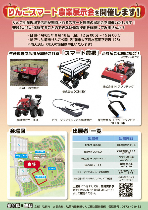そこで、これまで以上に生産性を向上させるほか、環境問題に対応するため、果樹生産現場で活用できる最先端の機器やシステム等を広く紹介し、実際に体験できる「持続可能なりんご産業を目指すスマート農業等展示会」を開催いたします。