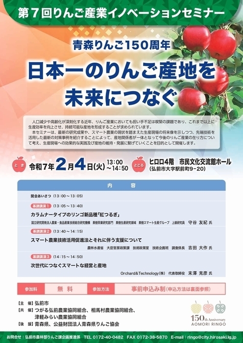 第7回の開催を迎える今年度のセミナーでは、「青森りんご150周年 日本一のりんご産地を未来につなぐ」をテーマに、省力栽培が可能なカラムナー性の新品種や、スマート農業技術の活用促進に向けた施策、経営力の向上と産地の維持などについての講演を行います。
