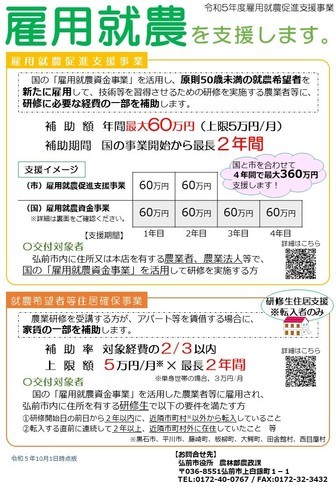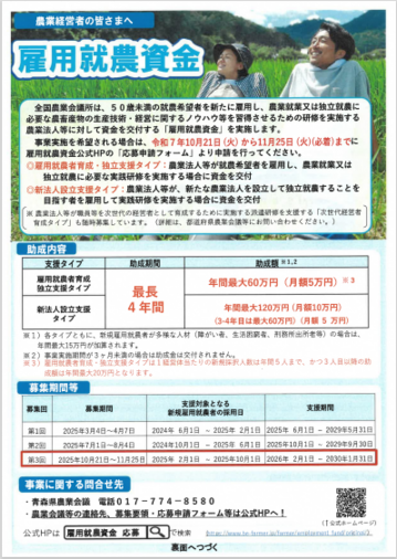 県外からの移住者を雇用する予定またはお考えの農業者向けに、移住担当部門(弘前市・県)においても無料職業紹介事業や、採用される方向けの様々な支援制度があります。