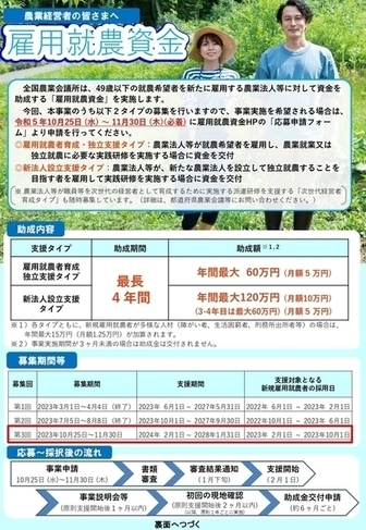 市では、雇用就農を促進するため、国の「雇用就農資金事業」を活用し、原則49歳以下の就農希望者を新たに雇用して、技術等を習得させるための研修を実施する農業者等に、研修に必要な経費の一部を補助します。