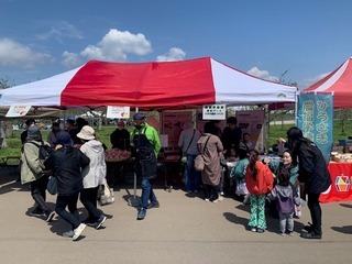 農福学連携の取組をより多くの方へ知ってもらうため、2025弘前りんご花まつりのりんごマルシェブースで「農福学連携マルシェ」として、福祉事業所のアップルパイなどの販売と併せて市の農福学連携事業の紹介をするブースを出店しました。