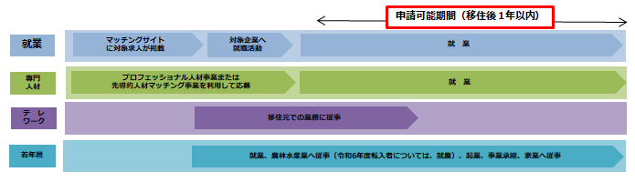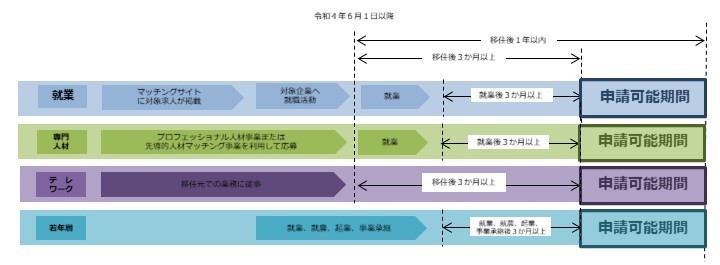 次の共通要件すべてに該当し、「就業」「専門人材」「テレワーク」「若年層」のいずれかに該当する方が交付の対象となります。