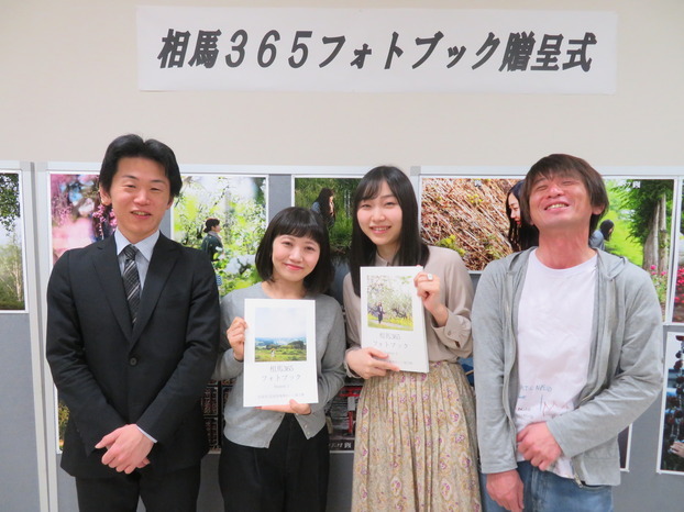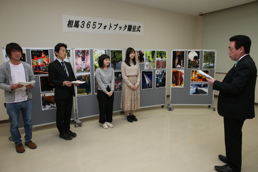 また、フォトブックの完成を記念して、平成30年4月22日には「相馬365」Season1・Season2のモデル、撮影者が勢ぞろいし、相馬総合支所にて贈呈式が行われました。