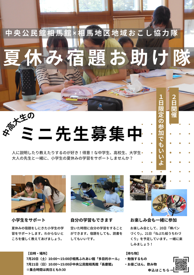 7月20-21日、中央公民館相馬館と相馬地区地域おこし協力隊がコラボして行う「宿題お助け隊」において、参加する小学生の学習をサポートするミニ先生を募集しています