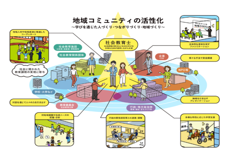 社会教育士とは、上の図のように人や団体のつなぎ役としての役割が期待され、そのためのコーディネート力、ファシリテート力がある専門人材だと言われています。