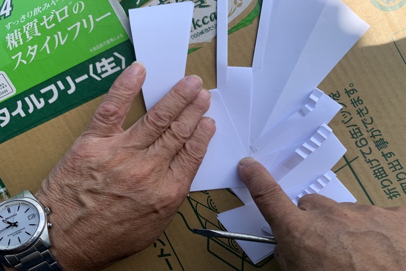御幣も手作りです。切れ込みの入った台紙が売っているものかと思っていましたが、カッターを用いて自力で作ります。