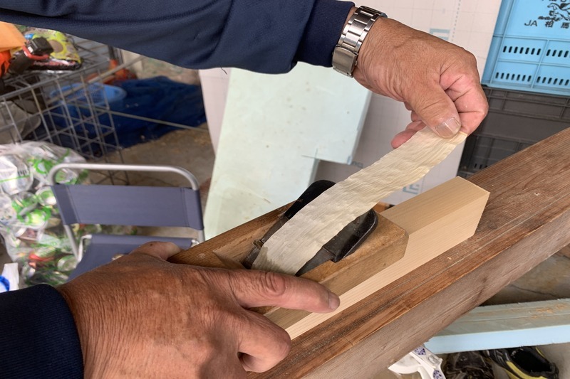 近年、ビニールテープで作る団体が多いなかで、相馬有志会のカンナガラ御幣は、ヒバの木を鉋掛けして作ります。地区に腕のいい大工がいるからこそできることです。