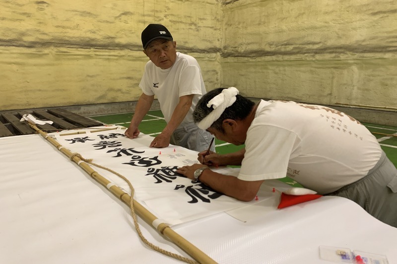 幟にその年に生まれた子どもの名前を書くのが風習なようです。有志会メンバーの3名に子どもが生まれたので、その子らの名前を記していきました。
