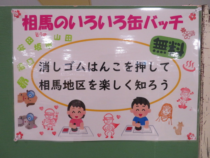 相馬に関するさまざな消しゴムはんこを使って缶バッヂづくりを体験するブースです。