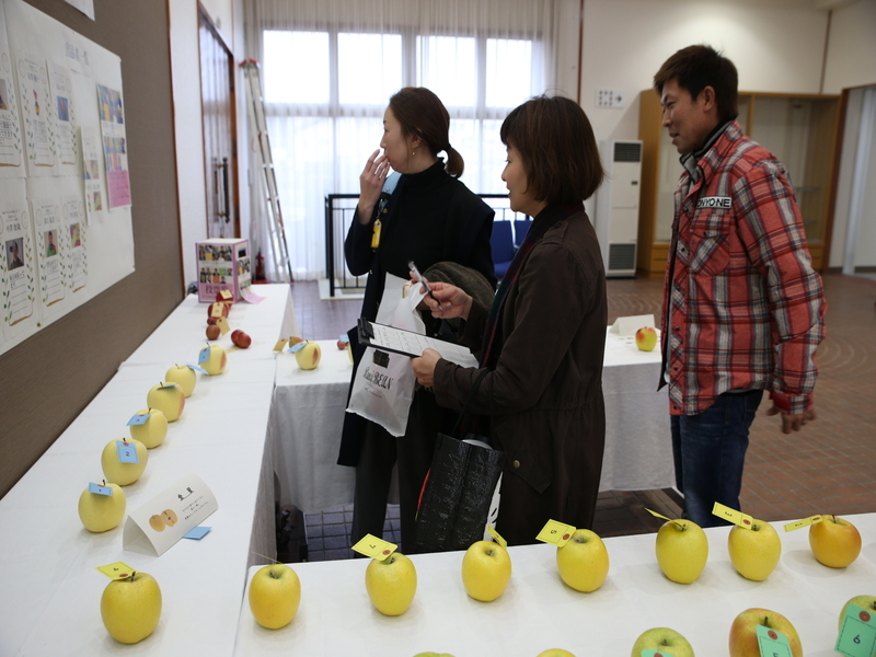また会場では、地区りんご生産者の「成果発表の場」を作ることを目的とした「“わ”の1コを選んでけ!」も行われました。これは、りんごの色や形、大きさを品評するもので、出品者38名の想いが詰まった、計70個のりんごがずらりと並びました。審査は来場者による投票で行われ、今年は見た目の個性を競う「無差別級」も登場したことで、大人から子供まで予想以上のご投票をいただきました。