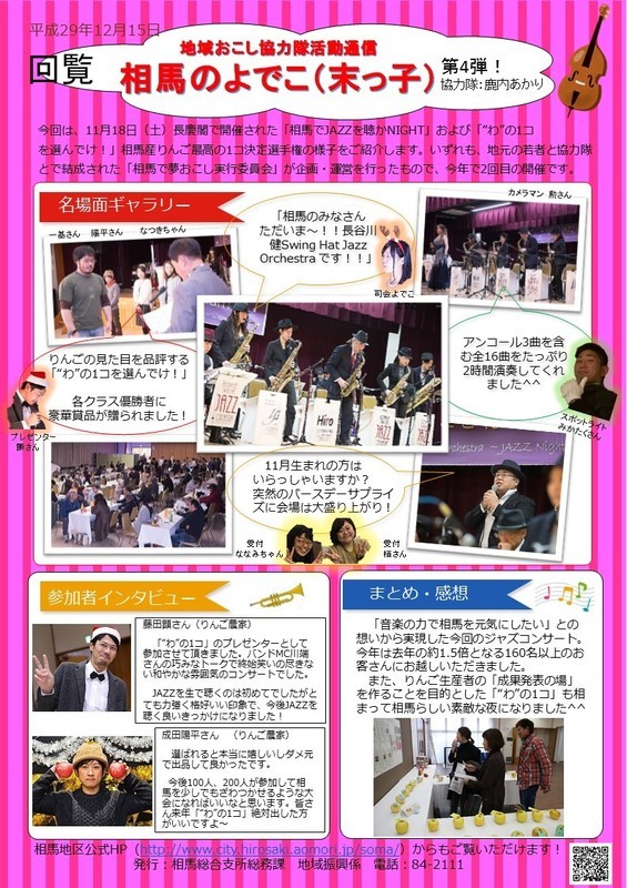 今回は11月18日(土)、相馬地区内の長慶閣にて開催された「相馬でJAZZを聴かNIGHT」および、相馬産りんご最高の1コ決定選手権「“わ”の1コを選んでけ!」の様子をご紹介します!