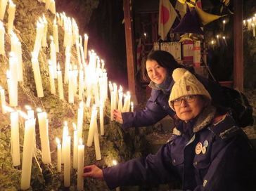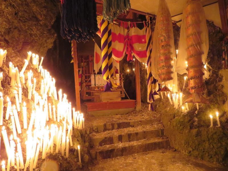 その起源は、かつて壇ノ浦でほろんだ平家の霊を供養したのが始まりとも伝えられています。参拝者は小高い場所にある「岩屋堂」と呼ばれるほこらの岩肌に、五穀豊穣や無病息災、家内安全などの思いを託して火をともしたろうそくを立て、翌日2月9日朝に、そのろうのたれ具合で豊凶を占います。ほこら内は願いの込められたろうそくのオレンジ色の炎が幻想的で、晴れた日には月の明かりが照らし幽玄な世界が広がります。