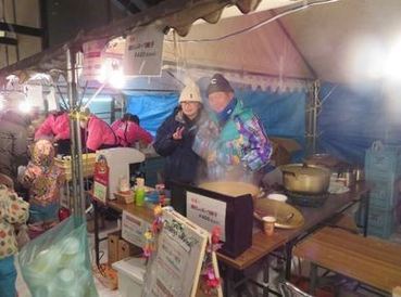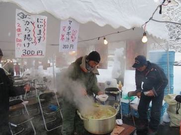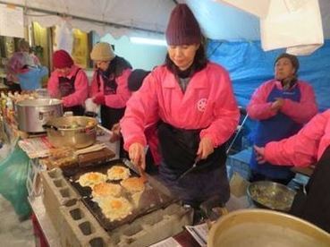岩木山商工会女性部はビールやワンカップを含めた飲み物、温かい甘酒、お好み焼き、こんにゃくおでん、焼鳥、フランクフルト、そばうどん、おにぎり、いなり寿司など選びたい放題!元気なお母さんたちと話しながら食べる温かいメニューは、お祭りならでは☆