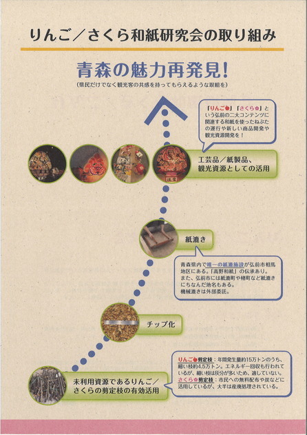 これは弘前大学主催の産学官連携事業で、廃棄される剪定枝を和紙に作り変え、弘前の工芸品や紙製品、お土産品など観光資源に活用していこうとするものです。