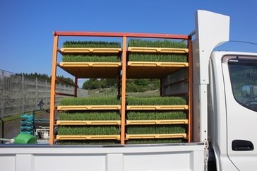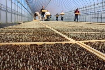 3日程して芽が出たらビニールハウスに並べて育てます。