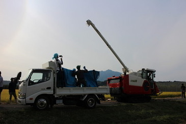 ある程度の量になるとノズルを伸ばして、軽トラ荷台の大きな袋に玄米をザザザーッと排出します。