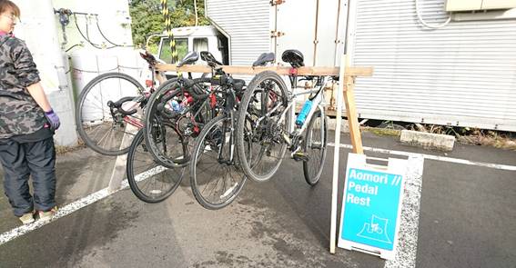 バイクラックに加えて、高圧空気入れ(仏米英バルブ対応)と簡易工具を配備しているのがありがたい(レジにて貸出)。アップルロードをサイクリングする際の立寄り処としてもおすすめ。
