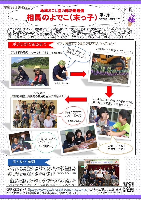 7月~8月にかけて、相馬地区に住む高齢者の方を中心に「オリジナルラベンダーポプリ」を製作し、プレゼントしました!