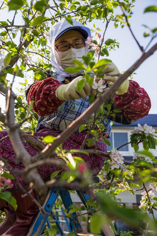 余分なりんごは花のうちに摘むのが楽だよ~。実より花の方が柔らかいからね。