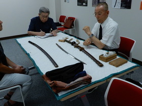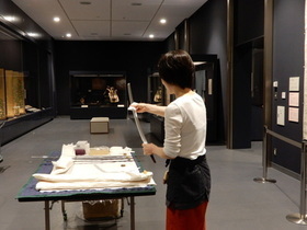 さらに今回は、展示の裏側の様子を紹介します。今回の展示では、10点の刀剣類を見ることができます。展示中の刀剣類は、閉館後、学芸員により、定期的に手入れされています。刀剣類は鉄でできているので、きちんと手入れをしないとすぐに錆びてしまうからなのです。 下の写真は手入れの様子です。 時代を経て受け継がれてきた輝きが、失われないようにさらに大切に管理されているのです。