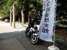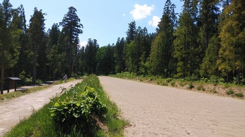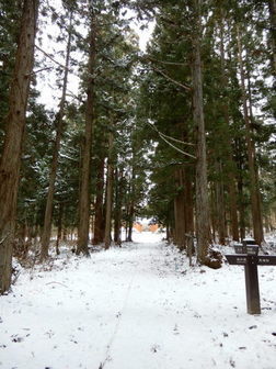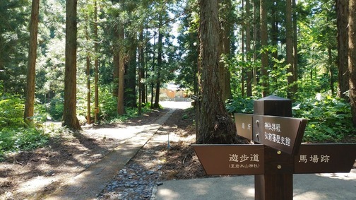 馬場跡は、拝殿と本殿に並行して、向かって右手にありますが、本殿から約200m先に奥に進むと、4代藩主津軽信政の墓(廟所)があります。その途中、左手に小道があります。徒歩約30~45分で森の中を通って、岩木山神社に行くことができる遊歩道です。