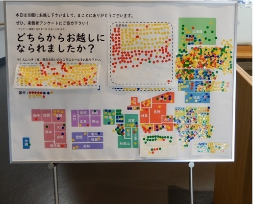 歴史館では、展覧会「日本刀の美」の開催にあわせて、7月19日から9月16日までの期間、来館者アンケートを行いました。 受付カウンターの横に専用ボードを設置し、それぞれのお客様のお住まいの地域にシールを貼っていただきました。