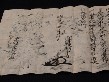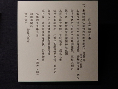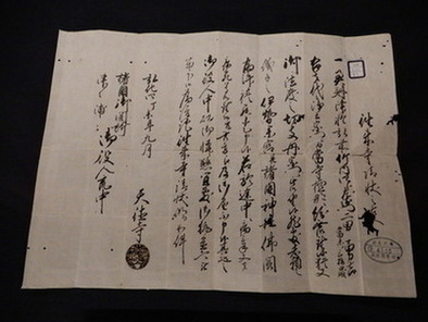 左下の「花押(かおう)」というサインの中に見える赤茶色のしるしが、「血判(けっぱん)」です。自身のサインと血でもって神に誓う、という340年前の生身の藩主の強い想いが伝わってくる、貴重な一枚です。お見逃しなく!