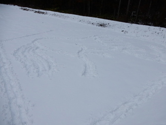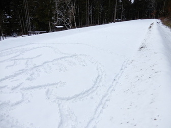 また、先日、隣接する高照神社と津軽信政公廟所、さらに馬場跡を散策したところ、馬場跡に雪を踏み固めて描いた不思議な図形がありました。 よーく見ると絵馬でした。 歴史館には重要文化財の太刀と共に藩主や家臣が奉納した絵馬も保管しています。その絵馬の一つを描いたものでした。精度に課題はあるものの、長さ150m、幅15mの平坦な馬場跡がアートに変身した瞬間でした。 後で聞いたら、この絵馬は、歴史館職員がお昼休みに描いたものでした。