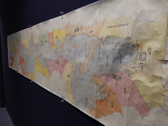 この絵図は、「摂州従大坂肥後海上道法図」といい、江戸時代の瀬戸内海を中心に大坂から肥後国(現在の熊本県)までの海上交通経路を図化したもので、沿岸の城郭や町などが描かれていて楽しめます。 その他にも絵図や日記などの古文書と共に武具なども展示しますので、1月10日の開幕をお楽しみに。