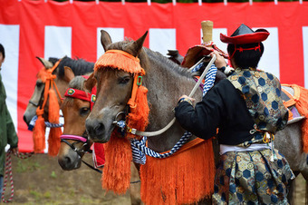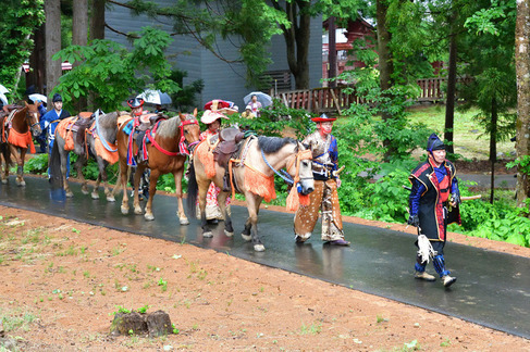 こちらは高照神社鳥居前から流鏑馬騎射隊お披露目行列の様子です。4頭の馬が射手に引かれ馬場跡へ。