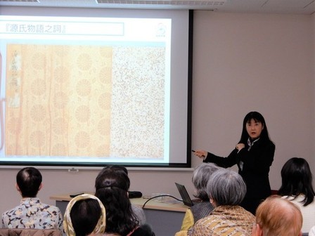 2月2日の歴史館講座は弘前大学の渡辺麻里子先生に「弘前藩主の学問と教養―高照神社所蔵『源氏物語之詞』をめぐって―」というタイトルで、30名を超える受講者に対し講演していただきました。 『源氏物語之詞』は源氏物語54巻の本文の一部を54人の公卿などによって抜粋し書かれたものです。(今回の展覧会では展示されていません。) 筆でさらさらと書かれたくずし字を読むことは、活字を使う私たちにとって難しいものです。 ですが、先生のわかりやすい説明は、『源氏物語之詞』はもとより、古文書というものをぐっと身近な存在にしてくれたように思います。