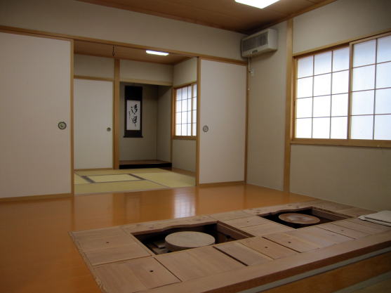 静粛な雰囲気が、より緊張感を高めます。 陶房入口の陶板表札や、奥の日本間にある赤絵で装飾した襖の引き手がしゃれています。