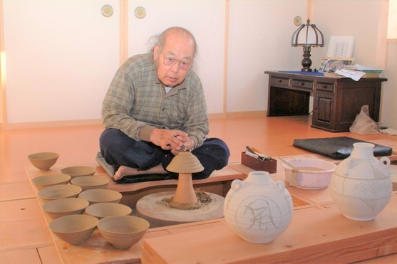 この陶房で鳴海要の作陶がはじまり、ロクロを回す姿がありました。
